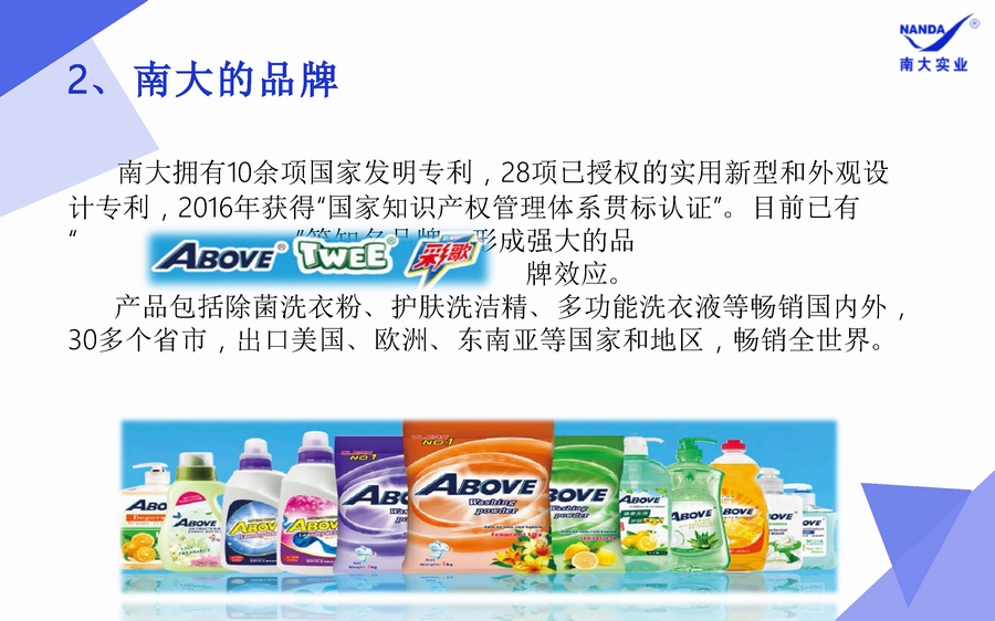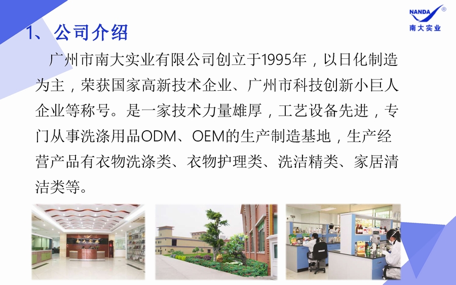 廣東南大集團股份有限公司創(chuàng)立于1995年,以日化制 造為主,有著三十年以上行業(yè)服務(wù)經(jīng)驗和口碑。榮獲國家高新技術(shù)企業(yè)、廣州市科技創(chuàng)新小巨 人企業(yè)等稱號。是一家技術(shù)力量雄厚,工藝設(shè)備先進, 專門從事洗滌用品ODM、OEM的生產(chǎn)制造基地,生產(chǎn)經(jīng)營 產(chǎn)品有衣物洗滌類、衣物護理類、洗潔精類、家居清潔 類等 。